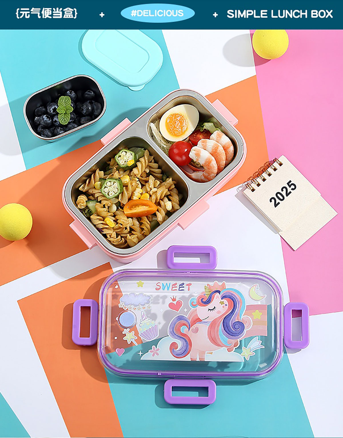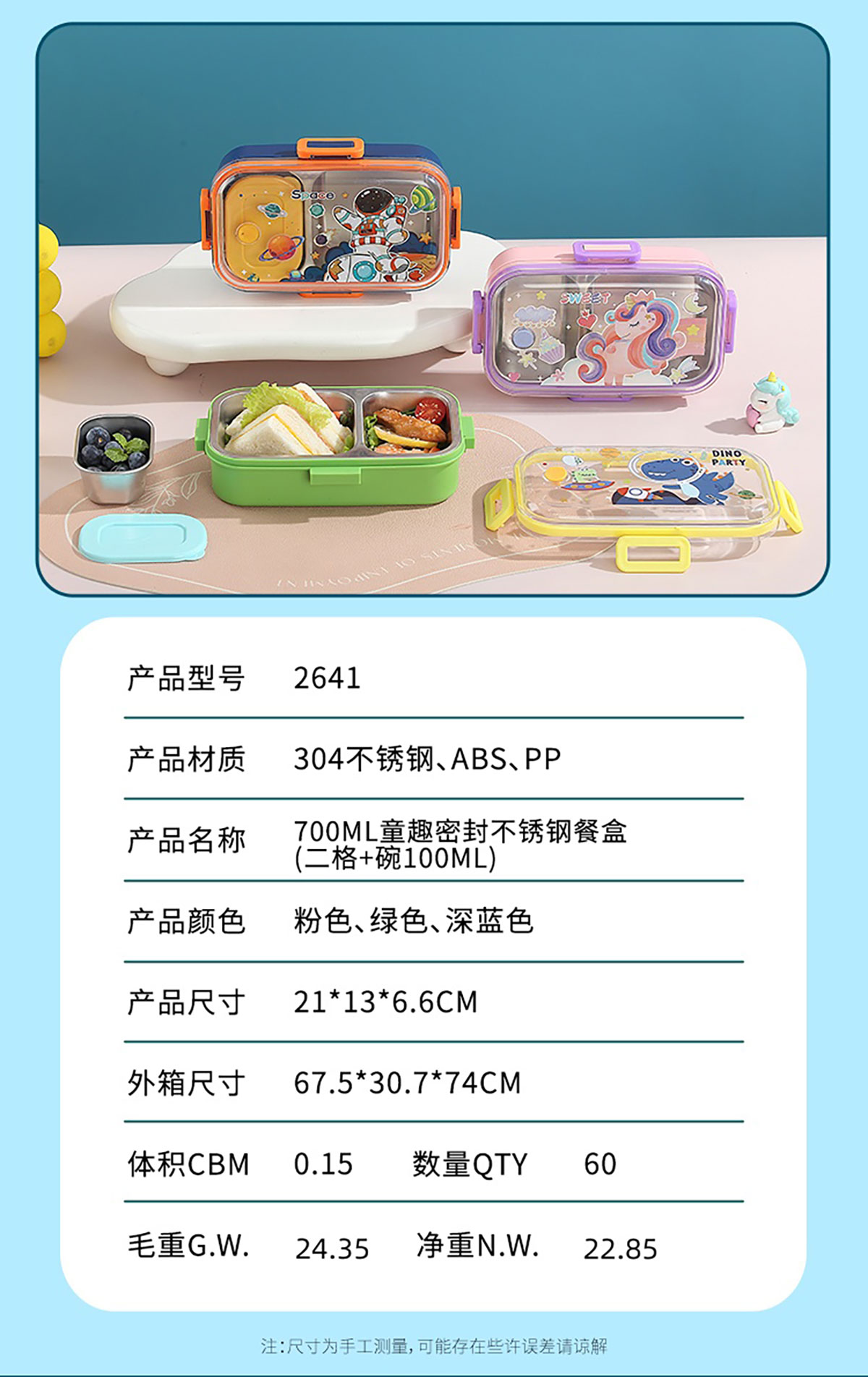 700ml童趣密封不銹鋼餐盒(單格+PP碗150ml/2格+沙拉碗80ml/2格+不銹鋼碗100ml)