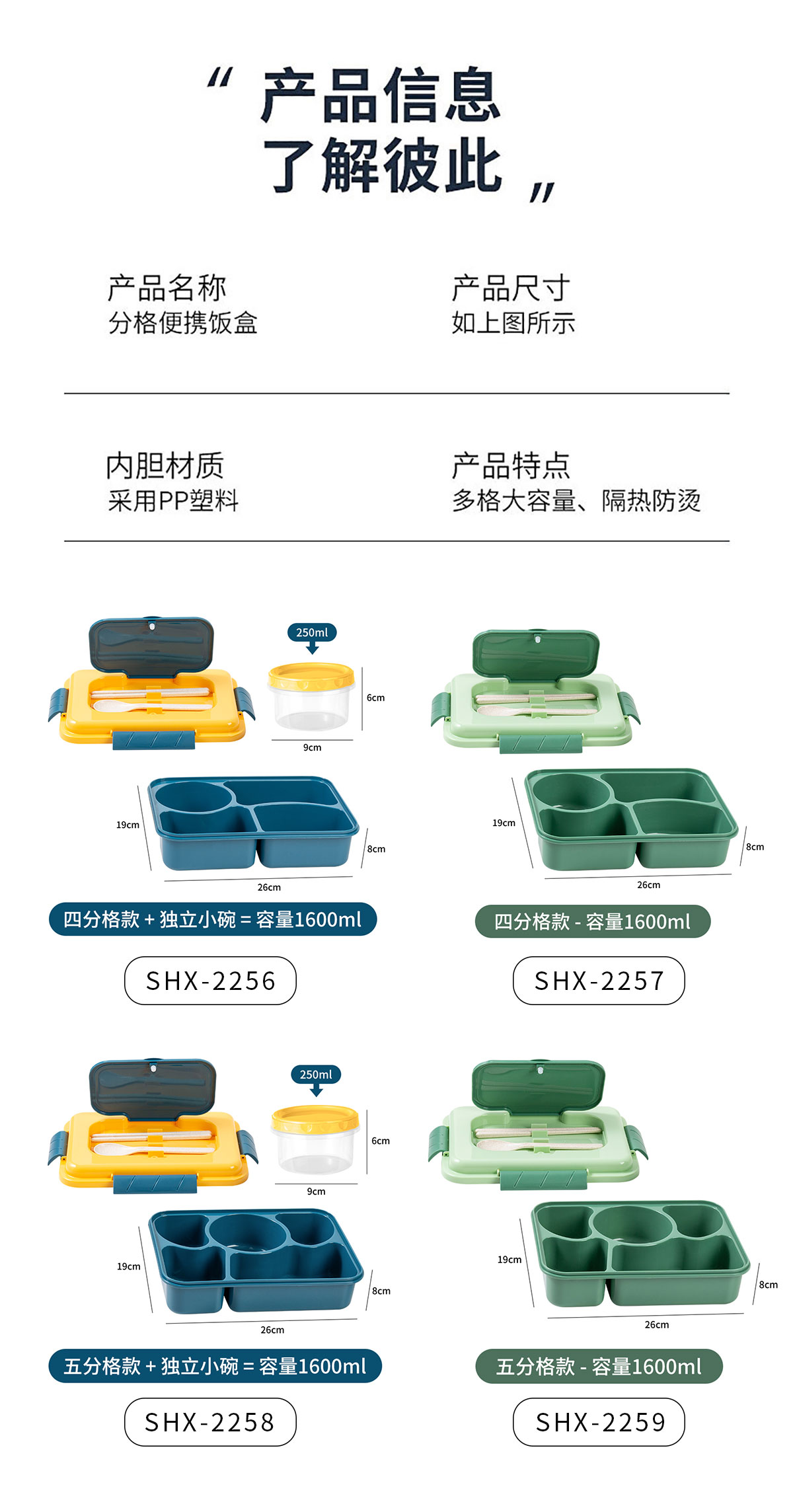 SHX-2256(四格帶湯碗):飯盒:260*190*80mm 湯碗:Φ90*60mm/250ml